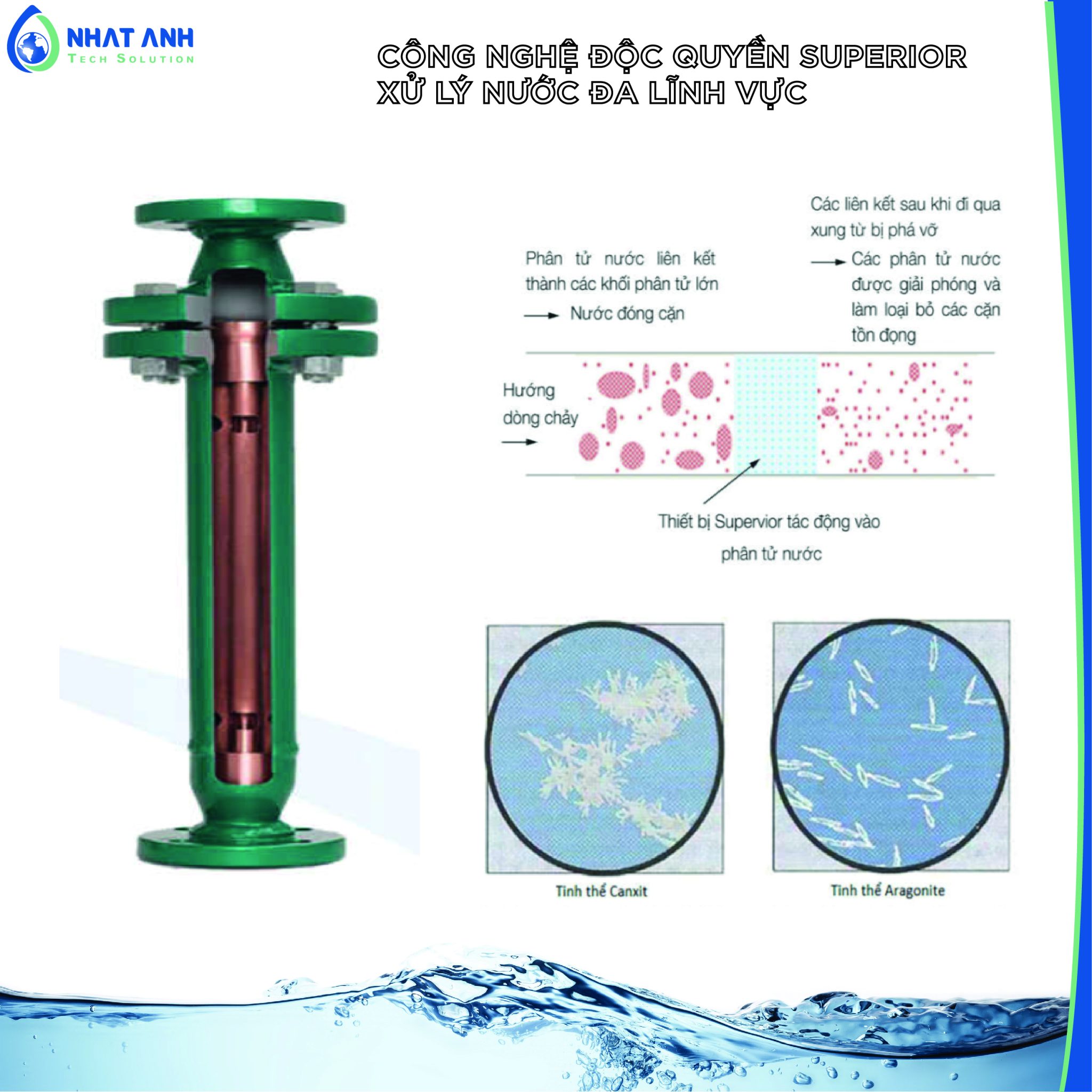 • Khi nguồn nước đi qua thiết bị Superior, lực từ trường của lõi nam châm vĩnh cửu phân cực phân tử nước ở trạng thái Aragonit lơ lửng, nhầy, rất mỏng khiến không thể hình thành cặn bám trên đường ống.
