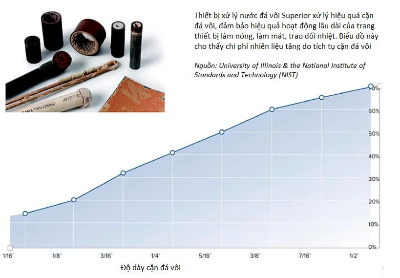 Theo National Institude of Standards and Technology, chỉ 10 mm cặn đá vôi sẽ làm tăng đến 50% chi phí nhiên liệu. Thiết bị xử lý nước đá vôi Superior chính là biện pháp tốt nhất giúp chống hình thành cặn đá vôi hiệu quả.